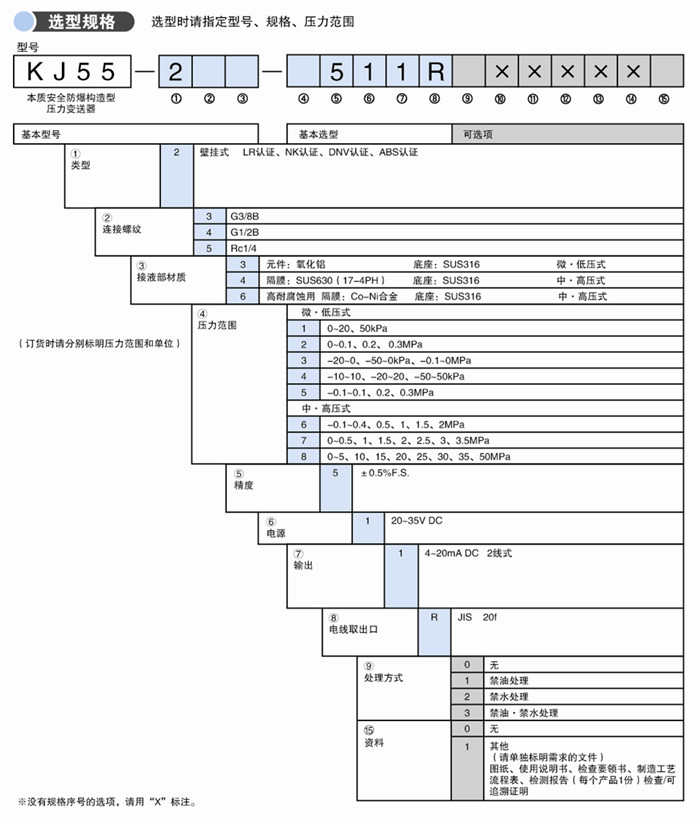 該產品配備安全柵一起使用,是一種符合IEC本質安全防爆的 船用壓力變送器,可以使用在持續存在爆炸性氣體的第0種場合及第1種、第2種危險場所。(Eex ia C T5)